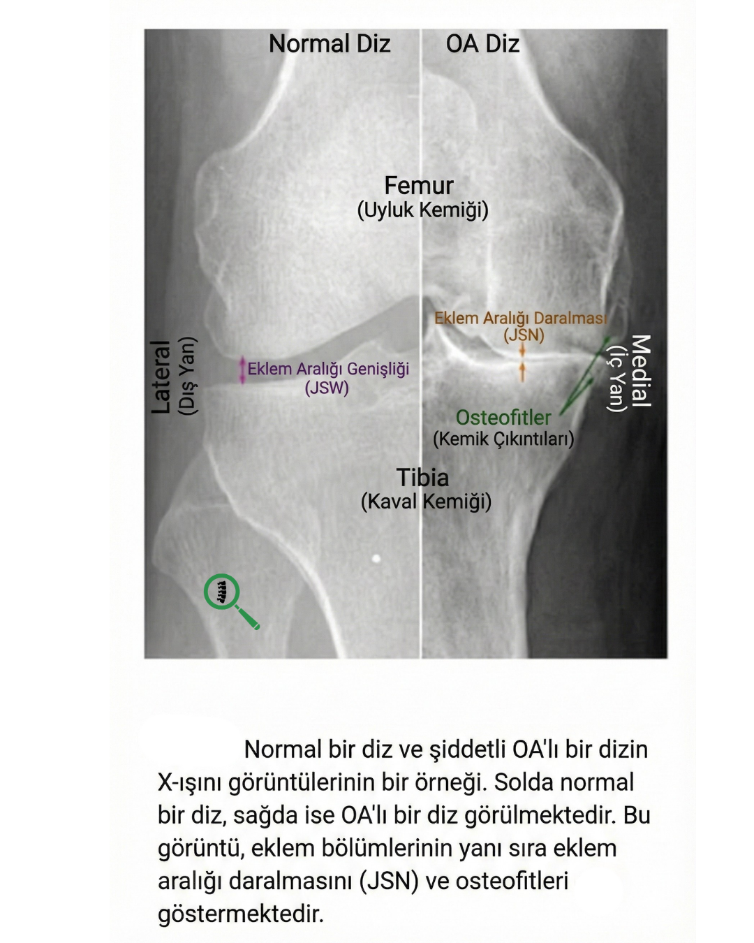 - Röntgen (X-Ray): Kireçlenme tanısında kullanılan ilk ve en temel görüntüleme yöntemidir. Röntgende kıkırdak dokusu doğrudan görünmese de, kıkırdak aşındıkça kemikler arasındaki boşluğun daralması ve eklem kenarlarında "osteofit" adı verilen yeni kemik çıkıntılarının oluşmasıyla kireçlenme anlaşılır.