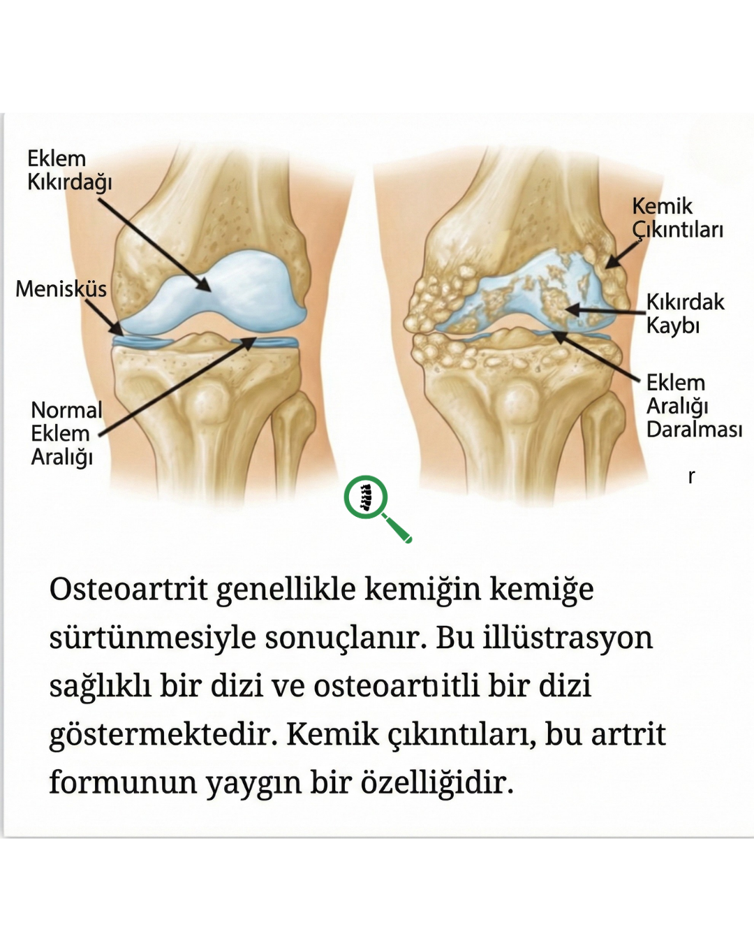 - Şekil Bozukluğu ve Sert Yumrular: İleri evrelerde dizin normal yapısı bozulabilir. Ayrıca eklem kenarlarında "osteofit" denilen ve ele sert yumrular gibi gelen yeni kemik oluşumları fark edilebilir.